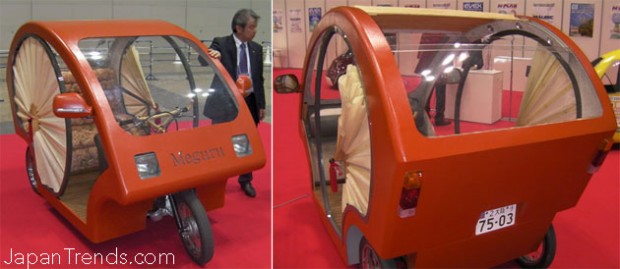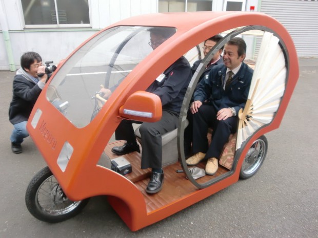 It looks much like a rickshaw, but the so-called Meguru [JP] is more of an electric car than a human-powered cart. Jointly developed by Osaka-based Yodogawa and Kinki Knives Industries, the Meguru is powered by a lithium-ion battery that, once fully charged, offers a travel distance of 25 miles. The vehicle, which is actually registered as a car, reaches a top speed of 25mph.