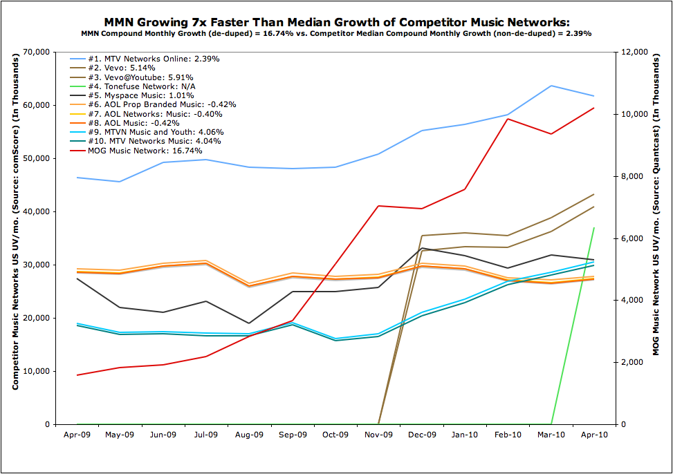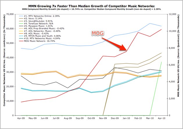 Things seem to be going well for MOG, the online music company that offers both an on-demand streaming music service and a large network of music blogs. In February the company raised another $9.5 million in funding and it has some promising mobile apps slated for release this quarter. Now the company is sharing some of its growth figures and how they compare with the rest of the industry.