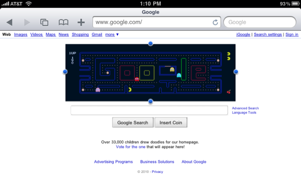 UPDATE – I was curious as to whether this doodle would work on mobile browsers so I fired it up in the iPad. It sat there for a moment but when the Javascript loaded it started up and I was able to play the game by sliding my finger up, down, left, and right on the screen. Pretty fun.