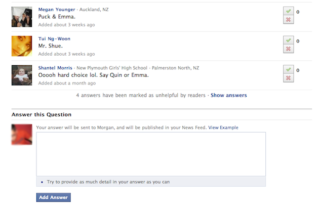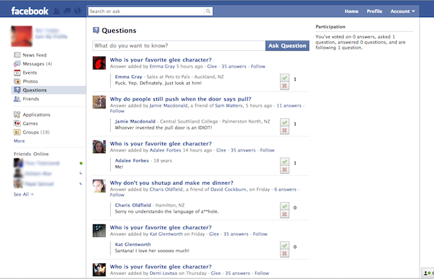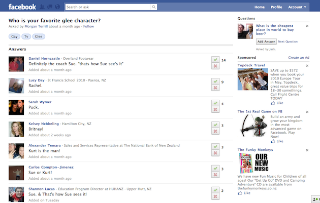 The question then appears on my friends’ (and appropriate answerers’) ‘Questions tab, which they can then answer. So far, some popular questions among my network include “Who is your favorite glee character?”, “Why do people still push when the door says pull?”, and “Where do people get good massages in Christchurch [New Zealand]?”.