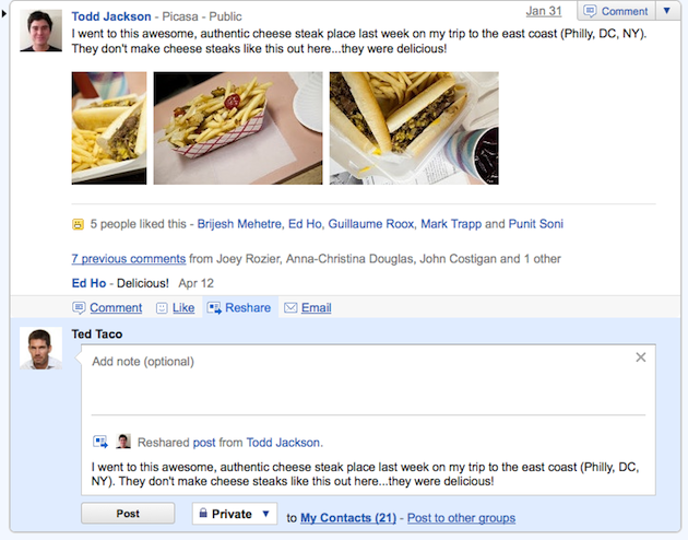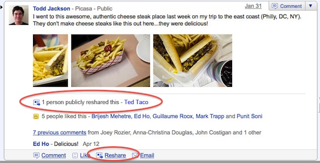- It’s a two-click process (“Reshare” then “Post). Google debated making it one-click, but decided having the option (in the drop-down) to reshare something with a limited group of people was important.