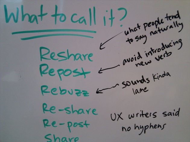 So, about the name. I asked Google why they chose to go with Reshare rather than the obvious “Rebuzz.” They pointed me to the picture below. Apparently, Rebuzz was being considering but was ultimately killed because it “sounds kinda lame.” That’s somewhat true, but for branding purposes, I think it may have been the right call. And I suspect people may call it this anyway. They also considered “Repost” but wanted to avoid introducing a new verb. So ultimately they went with the most literal choice.
