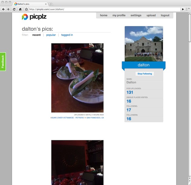 The website has evolved significantly since we first wrote about picplz in April. One feature I like is the “infinite page” – which continues to load photos as you scroll down the page. There’s no concept of a “next” button, and you can scroll forever, or so I assume, when viewing the global feed of pictures.