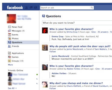 About a week ago, word started getting out that Facebook is beta testing a new “killer app” called Facebook Questions. For beta testers, the Questions feature appears in the left-hand column just below Events and Photos. It lets you ask and answer questions to and from your extended circle of friends.