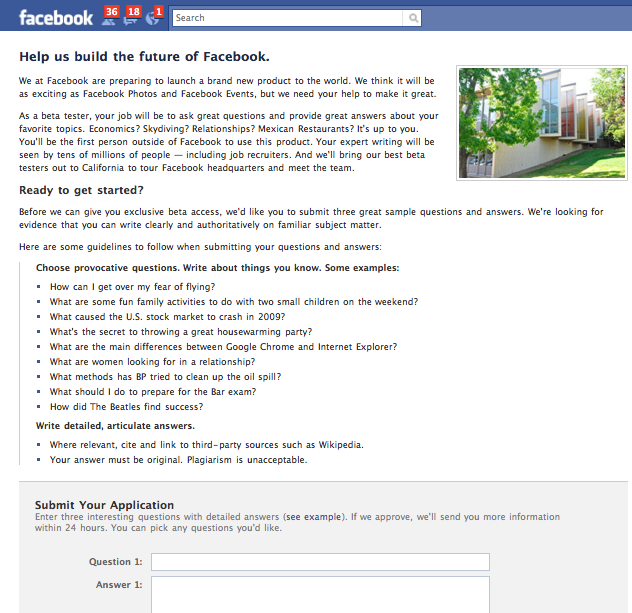 As a beta tester, your job will be to ask great questions and provide great answers about your favorite topics. Economics? Skydiving? Relationships? Mexican Restaurants? It’s up to you. You’ll be the first person outside of Facebook to use this product. Your expert writing will be seen by tens of millions of people — including job recruiters. And we’ll bring our best beta testers out to California to tour Facebook headquarters and meet the team.