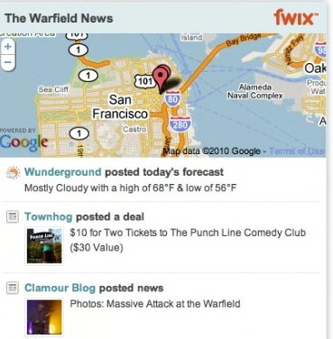 In addition to its existing local news API (which is already being tested by the New York Times Co. and the UPI), fwix is adding geo-tagged status updates (from Twitter, Foursquare, Gowalla, and Brightkite), geo-photos (from Flickr, yfrog, Smugmug, and Twitpic), local events (from Eventbrite, Eventful, Upcoming, and Zvents), nearby reviews and restaurants (from Yelp and Citysearch), concerts (Songkick), local crime and government data, weather, listings (Oodle, Trulia), and deals from local merchants (Groupon, Town Hog, and Living Social). A little map pops down you tell you where these places are.