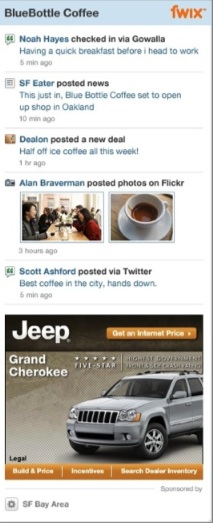 Publishers and sites can pick and choose whatever data they want and create widgets with a customized local feed they can place in a sidebar. These could include Tweets about about the publisher’s business, Flickr photos, check-ins, or Yelp reviews. Widget publishers can also opt to include ads in the widgets targeted to the same location and content on their sites and split the revenues with fwix. Affiliate links to group buying deals is another source of revenue.
