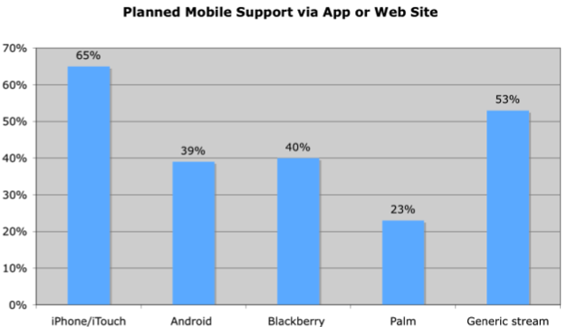 Other than the iPad, support for mobile devices goes beyond Apple devices. While 65 percent plan to support video on the iPhone via apps or an HTML5 Web video, about 40 percent plan on supporting Android and Blackberry devices. Again, the way to kill many birds with one stone is with HTML5 video through the mobile browser rather than developing separte video apps for each device.