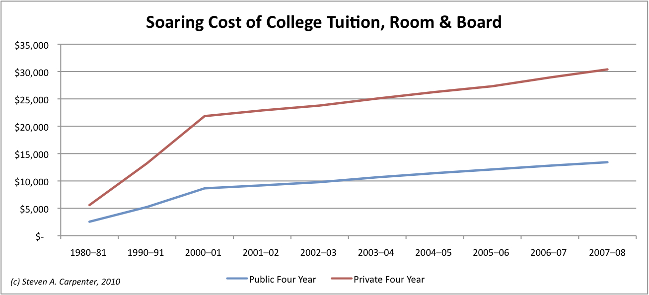 According to the Department of Education, the annual cost of tuition, room and board for a four-year public institution is now $13,500, while a private university will set you back $30,400.