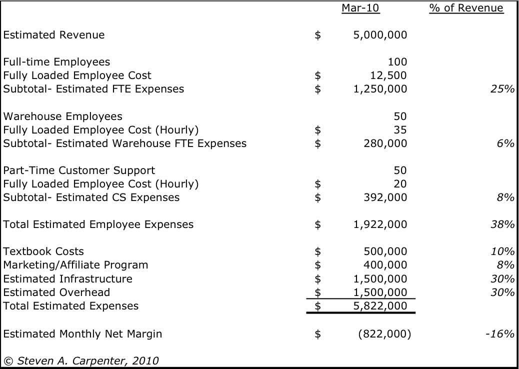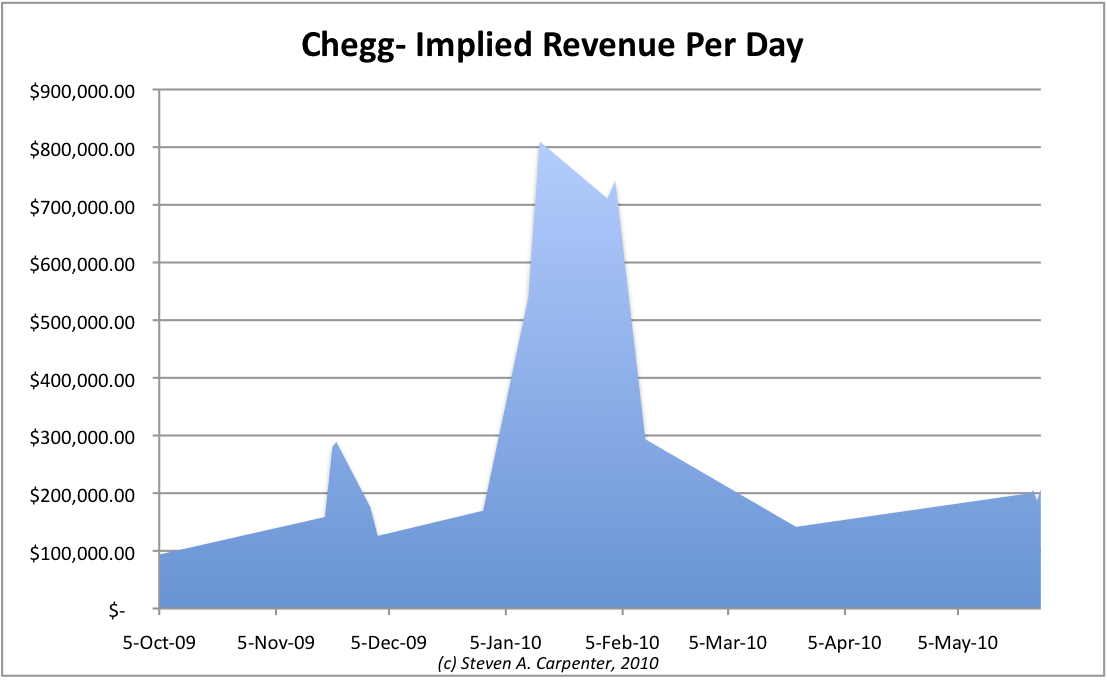 Jim Safka, the former Chegg CEO, said in an interview that the company generated $10 million in revenues in 2008. According to a company press release, Chegg saved students just over $16 million in 2008. That means the company is saving students 63% off the list price of books and making 37% in revenue. Using this ratio, I estimate the company did close to $1 million in revenue per day during the winter semester 2009-2010, an increase of four to five times its daily average of $200,000 a day during “off peak” business days.