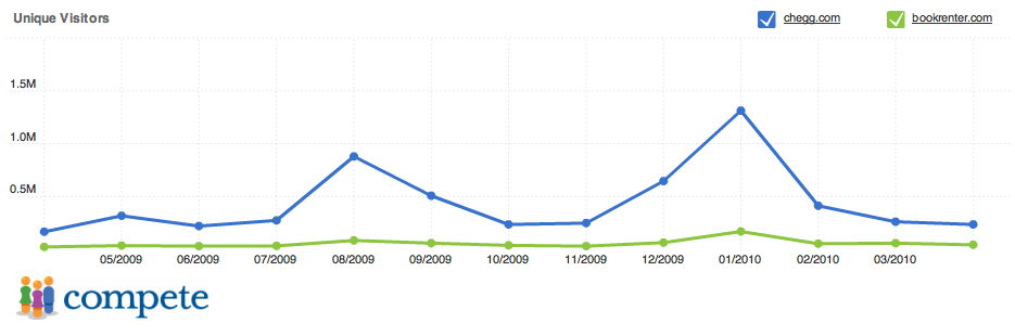 Chegg launched its rental service in 2007 and it quickly gained traction with students. Highly dependent on the fall and spring semesters when the majority of textbook-buying occurs, Chegg saw a nearly 2X increase in traffic to its website from Fall, 2009 to Winter, 2010. In January, it drew 1.3 million unique visitors, according to Compete. This was 10 times more than its closest startup competitor, Bookrenter. Based on its current growth pattern, I expect to see another 2X – 2.5X increase in traffic to the website this fall.