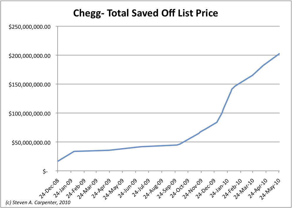 Sometime in 2008, Chegg began publishing on its homepage a real-time tally of the total dollars the company was saving its customers. Thanks to screenshot captures and Google image search, I was able to put together the following chart, which shows the explosive growth the company has experienced since the beginning of 2010. The company passed the $100 million savings mark on January 11, 2010 after two years of operation and needed just an additional three months to cross $200 million in May.