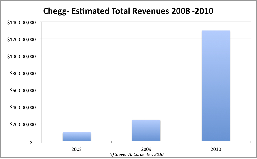 Chegg may very well be the fastest-growing, most successful, second-generation e-commerce startup that you hardly ever hear about,except maybe for the fact that it’s raised more than $140 million. Chegg is the “Netflix for textbooks.” It lets students across 6,400 college campuses rent from a virtual bookstore containing 4.2 million books. Based on my analysis (which I get into more detail below), the company is on track to generate $130 million in revenues in 2010, up from $25 million in 2009, and $10 million in 2008. During the January, 2010 semester, I estimate the company made close to $1 million in revenue a day, up fivefold from $200,000/day the previous January, and it should double that this coming September. My analysis suggests Chegg will do close to $50 million in revenue this September alone. It is underappreciated, to say the least.
