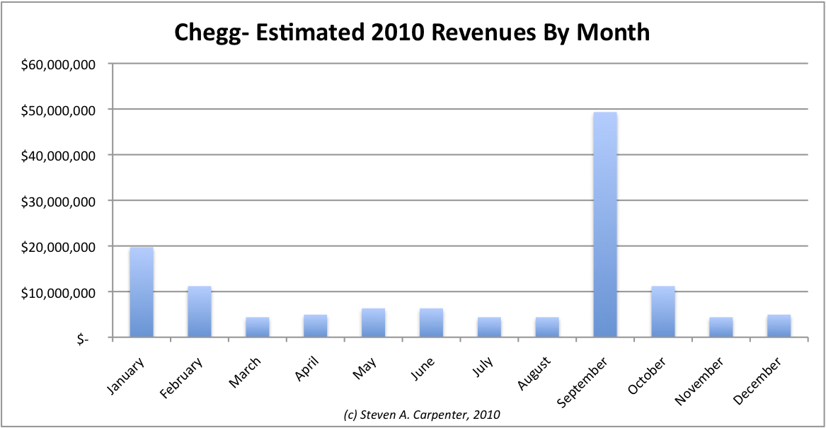 Based on this ratio, I estimate Chegg generated $25 million in 2009 and will do $130 million in revenues in 2010, accounting for increased traffic and awareness, almost half of which ($50 million) will come in September alone.
