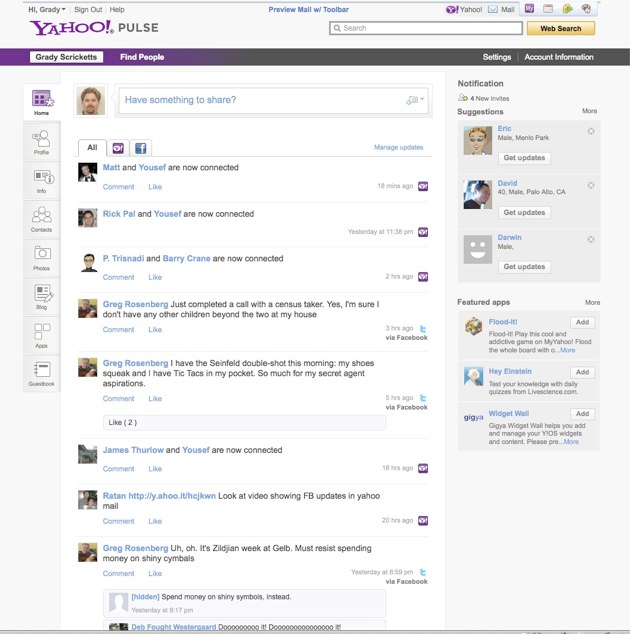 A Refresh of Yahoo! Profiles – Launched in October 2008, Yahoo! Profiles has allowed people to manage their identity and activities across Yahoo! from a central location. Today, Yahoo! has refreshed the experience to make its privacy settings easier to use and to give people a central dashboard to manage the external social network accounts and apps that they have linked to Yahoo!, starting with Facebook and with others to come later this year. Yahoo! Profiles has been renamed Yahoo! Pulse to better reflect its broader ability to manage settings, privacy, and account links. The updated experience is available at