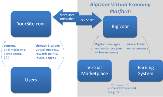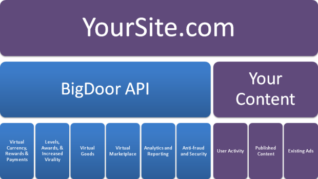 BigDoor essentially helps companies build game-like mechanics and loyalty programs into their sites or apps by enabling points, badges, levels, leaderboards, virtual currency and virtual goods – all which are becoming increasingly popular in the Web these days.