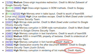 According to this post on the Google Chrome Releases blog, Apple gets credit for two of the eleven security issues that were fixed with the release of Chrome 5.0.375.70 on Windows, Mac, and Linux. Google does these posts with each new release to the various Chrome channels, and gives credit to the people who find bugs. They even reward money to those who find critical bugs — for example, one person got $2,000 this batch of fixes, and another got $500 (and some have humorously gotten $1,337 in the past).
