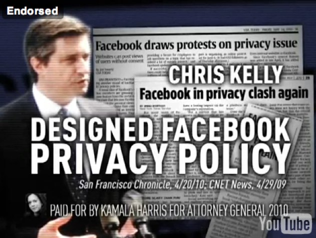 If that message wasn’t crystal clear try this brief video ad paid for by Kamala Harris’s campaign, the announcer says: “His only experience is designing a Facebook privacy policy condemned across the country. Chris Kelly released your privacy information.” Note to self, do not pick a fight with Kamala.