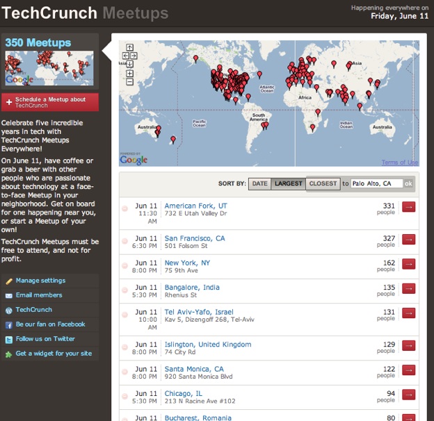 Check out the nearest city with a TechCrunch Meetup, or create your own. The biggest Meetup right now is in American Fork, Utah, with 372 people all going to a BBQ, followed by San Francisco (333), New York (164), and Bangalore, India (137). Come meet me at the one in New York City, or TechCrunch Europe editor Mike Butcher in the UK.