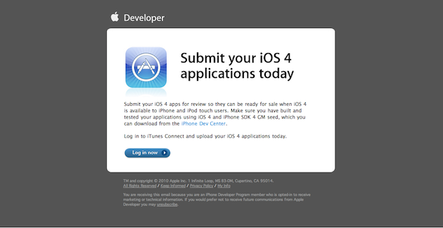 Today, Apple has begun emailing iPhone app developers to let them know they’re now accepting iOS 4-compatible apps in the App Store. Just as it does each time before a new OS launches (such as earlier this year with the iPad OS, which was iPhone OS 3.2 — yes, it’s a little confusing), Apple wants to make sure it has apps to show off when the new OS hits on June 21 (three days before the iPhone 4 launch).