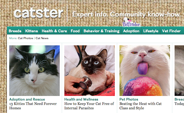 On top of the refresh, Dogster and Catster have a few new partnerships they’ve entered into. The first is a long-term strategic partnership with Petfinder.com. You can now search for and bookmark adoptable dogs and cats via the adoption areas on Dogster and Catster. And those that decide to adopt will be pointed to Dogster and Catster as a way to keep getting information about their new pets.