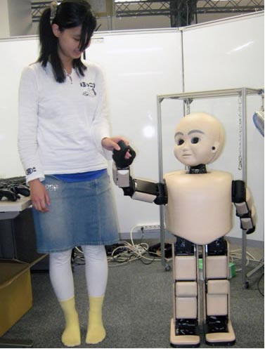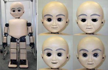 Weighing 27kg, M3-Kindy (“Kind” as in “Kindergarten”) is supposed to look like a 5-year old child (he’s pictured above). The robot boasts 109 touch sensors, 42 joints, two cameras (one for each eye), and two microphones (one for each ear).