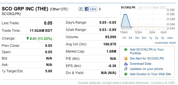 Eventually, the case even led to slander charges agains Novel and IBM. You know when you’re pulling the slander card you’re at the end of your litigious rope. Incidentally, they’re now at 5 cents in over-the-counter trading.