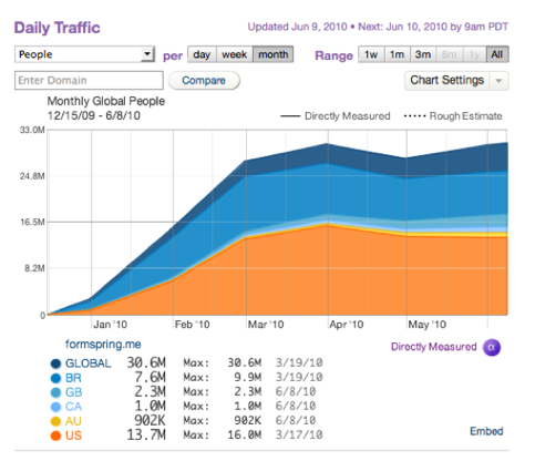 Back in January, I wrote about a new Q&A service called Formspring.me that allowed users to have their friends “ask them anything”: sign up for a profile, and anyone can submit a question that you can choose to answer at your discretion. At the time the service had around one million users. Fast forward six months: the service now has over 12 million accounts and users have asked each other 700 million questions. According to Quantcast, it’s the 61st most visited site in the United States. Formspring has also just launched a preview of its API in private beta, which you can request an invite to here.
