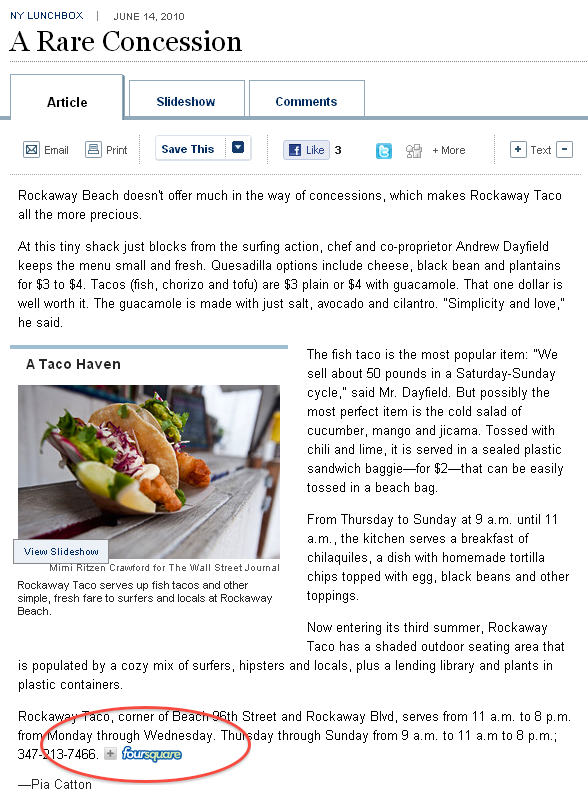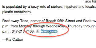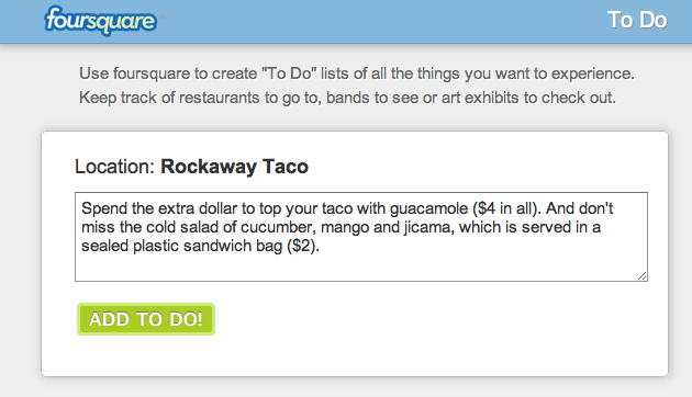 In some ways, this Add to Foursquare button seems more like Twitter’s new At Anywhere button. As we noted, it’s less about directly sharing, and more about extending the features of the site to the rest of the web. I know that I often read about new restaurants online but never remember to put them in my Foursquare to-do list — so this makes a lot of sense.