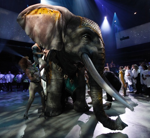 We all expected this, I think, to segue directly to the show itself. Not really: we stood about for another 15 minutes or so, until finally, finally, the music changed and we saw some scorpion-fern-lamps being brought out. My memory of the event here is a bit fuzzy, but I believe this is about the time when the elephant arrived. The couch had descended, I think, and the kid got off, and then… an elephant.