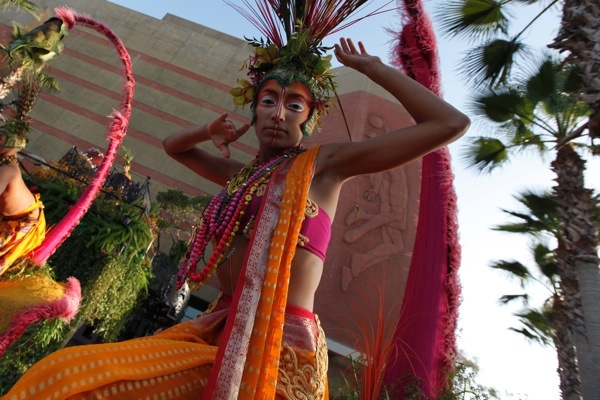 Finally, a bit after 7 if memory serves, they asked us all to crush forward, ruining our finely knit socio-physical networks and creating a rush toward the entrance. Fancifully made-up women and men were writhing rhythmically and sinuously beneath decorations that resembled ferns and scorpions’ tails equally, and their unexplained undulating had made us more curious than ever. The drum beat on.