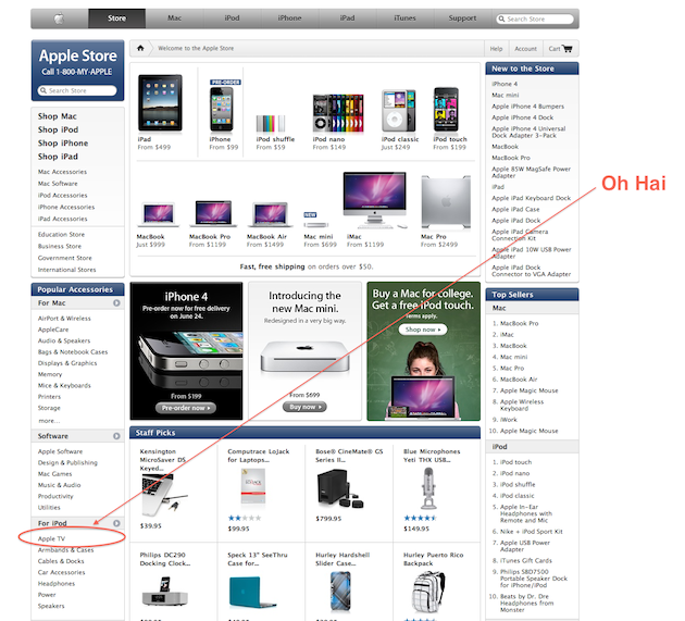 If you go to the Apple Store website right now, you’ll notice that every big piece of Apple hardware is highlighted except one: Apple TV. If you’re looking for it, you’ll either have to do a search, or you’ll want to look way over in the lower left hand corner under “For iPod.” Yes, Apple is now classifying the device they’ve famously belittled as a “hobby” for so long as an iPod accessory. Ouch.