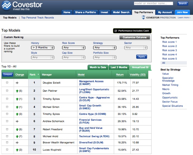 In fact, the entire site has been revamped. There is better search and more detailed investor profile pages. When you rank investment returns, you can toggle between the top tracked models which you can track with your own portfolio, and the top personal track records across the entire Covestor community.