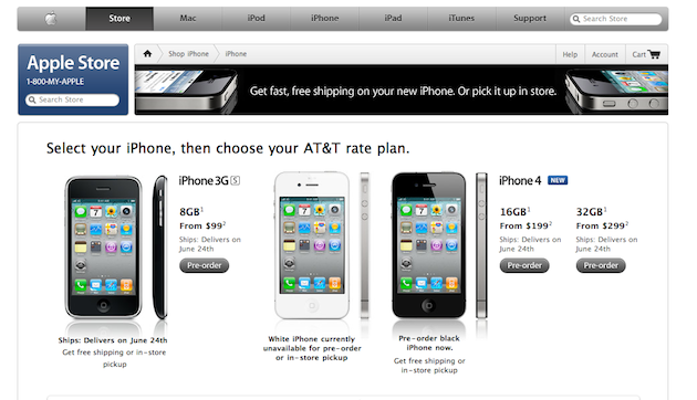 Meanwhile, if you want the black one, you can pre-order it now. As expected, it’s $199 for the 16 GB version, and $299 for the 32 GB version (assuming you sign a new two-year contract with AT&T for each). The phones will be delivered on June 24, or available for in-store pick-up if you choose that option.