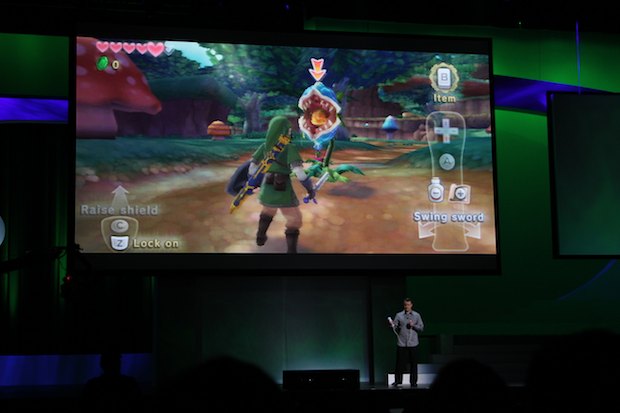 Here we go: another E3, another Zelda. The latest in the Zelda canon is Skyward Sword, a MotionPlus compatible game that mimics the experience of holding a sword and a shield. Link’s on-screen actions mimic your actions completely including the motion of a shield in front of you.