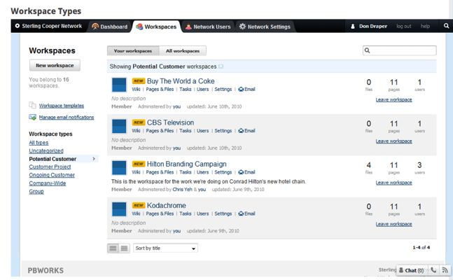 PBWorks, which had an overhaul of its user interface and features in 2008, offers businesses with a project management application and a customized wiki workspace, with mobile support, document management, access controls and more. Currently, PBworks manages 1 million hosted workspaces, with over 3 million users and has accumulated a loyal client base. The company serves teams at over a third of the Fortune 500, and was home to three presidential campaigns, the United Nations, The Financial Times and Harvard University.