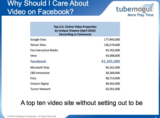 Facebook is now the fifth largest video site by audience size. ComScore estimates that 41 million people a month watch videos on Facebook, which is more than on Hulu, CBS,, or Microsoft’s sites. What is remarkable about Facebook’s rise as a video destination is that it isn’t even trying very hard to be a video site. “I don’t think Facebook has video strategy per se,” says TubeMogul CEO Brett Wilson.