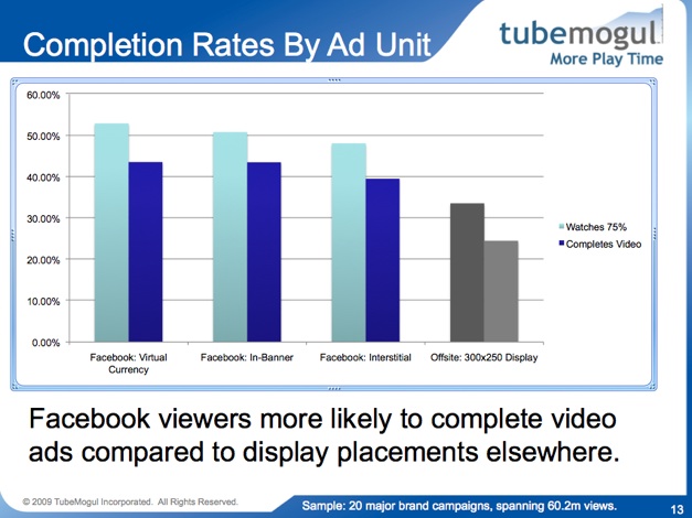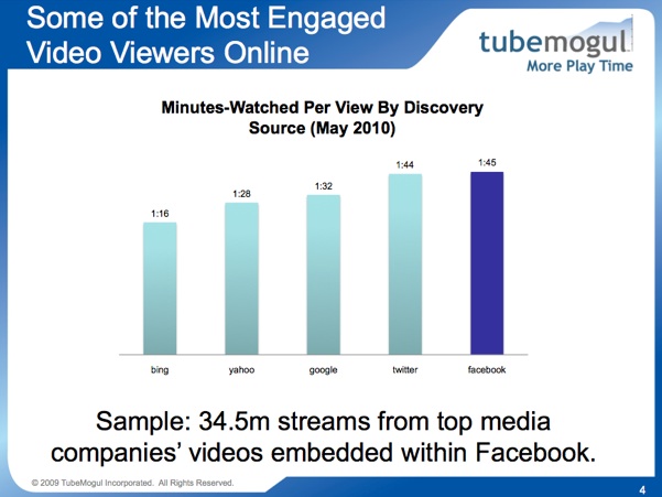 TubeMogul tracks video analytics across the Web, and it just released some interesting data on how videos and video ads perform on Facebook compared to other sites. On average, people who click on a video from Facebook are more engaged. They tend to watch longer than viewers who arrive from other sources— 1:45 minutes per view versus !:32 for Google (Twitter users are almost the same with 1:44 minutes per view).