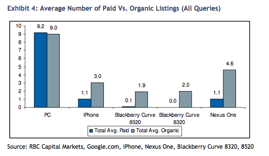 Sandler tested the same keywords across different devices (an iPhone, Android Nexus One, Blackberry, and aPC), and found that the average, for both the iPhone and the Nexus One, was 1.1 paid search results per query, compared to 9.2 search ads per query on a PC. Searches on Blackberries showed hardly any paid results.