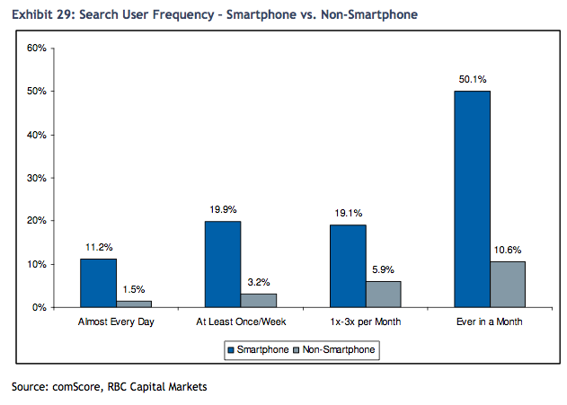So how many people actually conduct searches on their smartphones? According to comScore, half of all smartphone owners conduct at least one search per month, 20 percent search once a week, and 11 percent search almost daily (which is about the same as the percentage of people who search on feature phones every month).