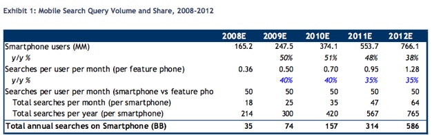 This year, Sandler estimates there will be 374 million people with smartphones, increasing to 766 million in 2012. Consequently, the number of smartphone searches will grow from 157 billion to 586 billion (up from 35 billion two years ago). The comparable number of searches on PCs this year will be 1.3 trillion, growing to 1.6 trillion in 2012. Any way you look at it, mobile searches will become a significant portion of total searches within two years. But how much will those searches be worth? That is still a guessing game at this point.