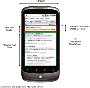 One big advantage the new generation of smartphones have over PCs in terms of search advertising is that the screen real estate devoted to search ads is much bigger. A single search ad on a PC takes up about 4 percent of the screen real estate, whereas a single search ad on a smartphone takes up about 20 percent of the screen. The relatively larger size of the ads results in higher click-through rates on mobile (as much as 3 to 5 times as much). On the iPhone, one search ad takes up 22 percent of the screen, and if two search ads are served up it takes up nearly half (48 percent). For Android, those numbers are 18 percent and 38 percent for one and two search ads, respectively.