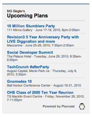 “These are the first pieces of our general platform strategy in which we want to power any and all plan-related listings on the web and do so with a thoroughly social context,” Hendrickson says about the new elements of Plancast. He notes that they have some other cool ideas in the works — particularly surrounding places, something which Twitter and Google are now targeting (not to mention Foursquare, Gowalla, Loopt, etc).