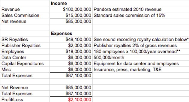 Pandora is the widely popular web radio service. Publicly they have said that they turned the corner to profitability in the 4th quarter of 2009. Below I forecast the 2010 numbers for Pandora using information from Pandora, music royalty rates that all webcasters are obligated to pay, and standard expenses of running a California based technology start-up.