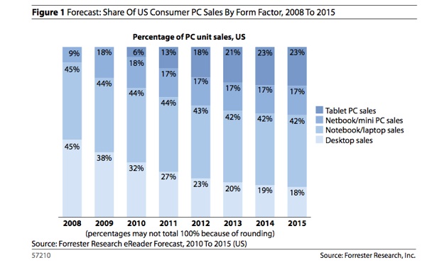 The tablet era has just begun, but Forrester Research is already predicting tablet sales in the U.S. will overtake netbook sales by 2012, and desktop sales by 2015. At the Untethered conference today in New York City, Forrester analyst Sarah Rotman Epps laid out her projections comparing tablet sales to netbooks, laptops, and desktops. She expects 3.5 million tablets (including the iPad and other tablets) to be sold this year, growing to 20.4 million in 2015. Meanwhile, she expects desktop sales to drop from 18.7 million units in 2010 to 15.7 million units in 2015.