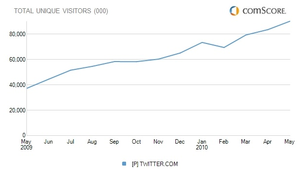 Online analytics firm comScore has released its latest batch of data, and this month’s results show that Twitter is still exhibiting strong growth. According to comScore’s numbers Twitter grew from 83.8M unique vistors in April to 90.2M in May worldwide — an increase of 7.6%. By comparison, there was 5.5% growth between March, when Twitter had 79.4M, and April’s 83.8M. To give some perspective, a year ago comScore showed that Twitter had 37.3M million uniques.