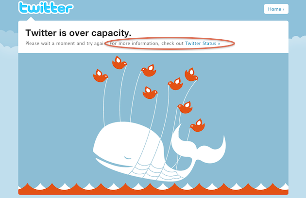 Twitter has tweaked the Fail Whale page (you know, the page you see all the time when Twitter is down) based on a comment one TechCrunch reader left on a post about Twitter’s downtime earlier this week. Okay, it’s not a huge change, but it’s a very useful one. On the Twitter Fail Whale page from now on, you’ll see a link to the Twitter Status blog below the headline: “Twitter is over capacity.”