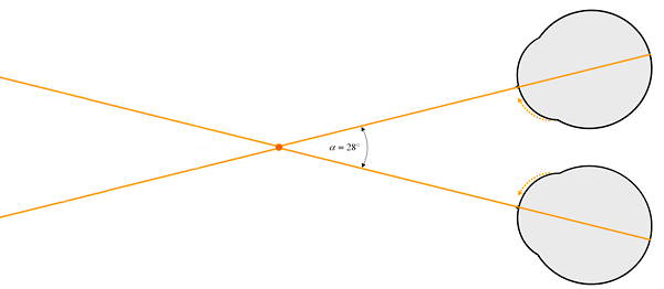 Even if it feels silly, just indulge me here: close just your right eye. Now just your left. Now your right. It’s like in Wayne’s World: camera one, camera two. You must have noticed that things change position a bit. This, of course, is because your eyes are a few inches apart; this is called the “interocular distance” and it varies from person to person. Note also that when you look at something close, objects appear in double in the background. Look at the corner of the screen. See how the chair or window back there is doubled? It’s because you’re actually rotating your eyes so they both point directly at what you’re focusing on. This is called “convergence,” and it creates a sort of X, the center of the X being what’s being focused on. You’ve probably seen a diagram like this one before: