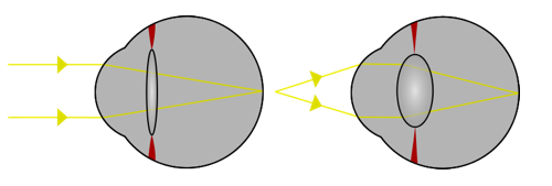 Next we have focus. Your eye focuses differently from most cameras, but the end result is similar. Try holding your finger out at arm’s length and focusing on it, then on something distant that is directly behind it. Obviously the focus changes, and you may have noticed that while the distant object was blurry while you looked at your finger, your finger (in double) was in focus while you looked at the distant object. That has to do with the optic qualities of your eye, which I won’t go into here, but it’s still important. More important, however, is this: try it again, and this time pay attention to the feeling in your eye. Feel that? Sort of like something’s moving but you can’t tell exactly what? Well, your eyes are rotating a bit, but only a few degrees, in order to converge further out, but more importantly, you’re feeling your the muscles of your eye actually crush or stretch out the lens of the eye, changing the path and internal focal plane of the light entering your eye. Farsightedness and nearsightedness occur at this stage, when either the lens or the eyeball itself is misshaped, resulting in focus being skewed or difficult to resolve one way or another.