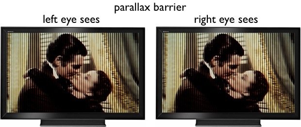 - It requires modification of existing screens. Although I can imagine a parallax barrier filter for a TV, it’s never going to happen. The technology must be tightly integrated with the display, which increases cost. It’s also possible that the parallax grill might be variable on large TVs with wide pixel pitch.